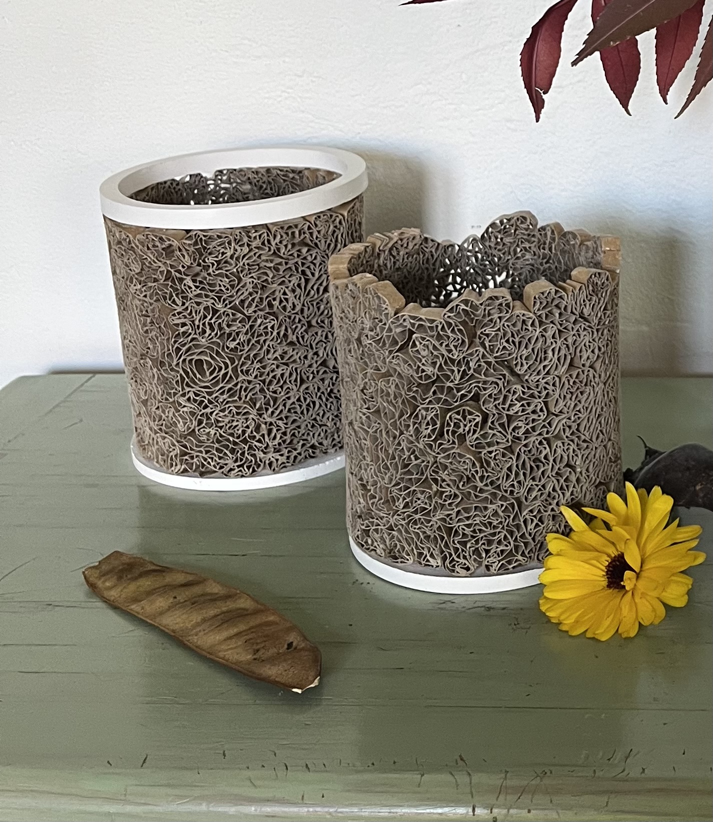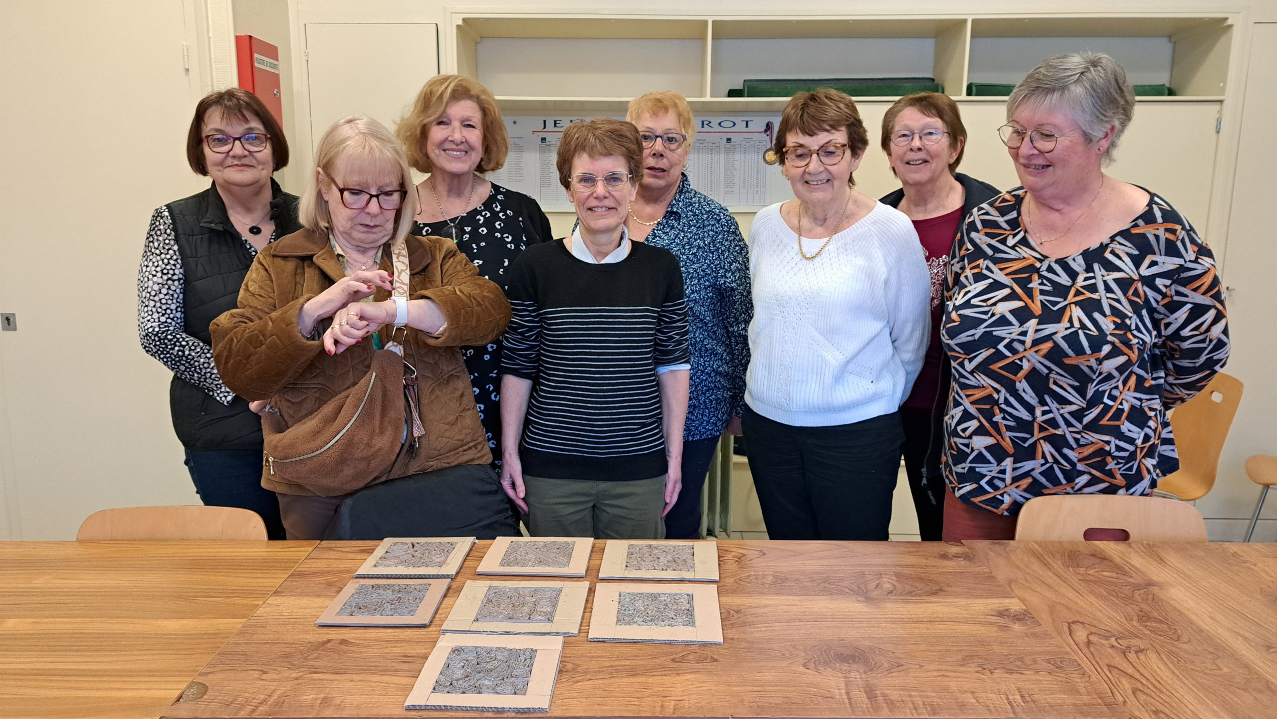 Ce lundi 9 mars, aux loisirs créatifs, nous avons fait dans la dentelle, mais pas n’importe laquelle, en carton (en bonnes citoyennes écolos que nous sommes). Nous avions fait venir une intervenante extérieure, Cécile Carlier, spécialiste de la cannelure, accompagnée de Karine Couderc, pour nous initier à cette technique qui devrait nous permettre de réaliser en nous perfectionnant des créations sympas.